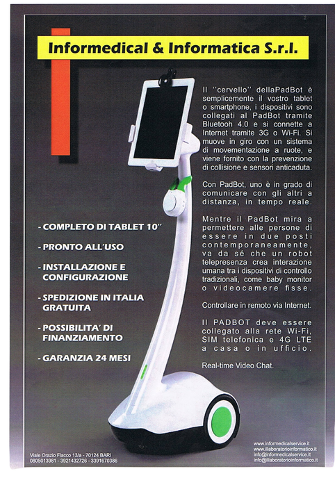 Il nostro robot può essere utilizzato nelle terapie intensive ed creare un collegamento visivo e parlato tra i degenti ed i loro parenti, può essere di ausilio al personale medico per leggere i dati sui monitor multiparametrici etc... PadBot è un robot che ha utilizzato iPad o tablet Android per fornire telepresenza. Le app Padbot supportano le piattaforme iOS e Android. Ha potenti funzioni come l'autocontrollo, il telecomando, la chat video in tempo reale, la dashboard degli amici, il QR-Code, ecc. L'interfaccia utente è unica ed elegante. Nel nostro sondaggio sugli utenti, le persone iniziano a usarlo facilmente senza leggere una singola riga del manuale dell'utente. La logica dell'interazione è chiara. Pulsanti e testo sono autoesplicativi. E le app PadBot supportano 26 lingue, un'applicazione veramente globalizzata. Il robot di telepresenza PadBot è stato aggiornato e ora include alcuni elementi unici oltre al suo sistema di prevenzione delle collisioni e al sistema anticaduta; che arresterà automaticamente il robot se è vicino a un bordo o in pericolo di caduta. Presenta inoltre una testa inclinabile e ascendente. Supporta sia Apple che Android Richiede WiFi DSL o GPRS su chiamante e ricevitore 8 ore di durata della batteria Testa inclinabile e ascendente Sistema di movimento su ruote e apparecchio estensibile In primo piano con sistema anticollisione e anticaduta